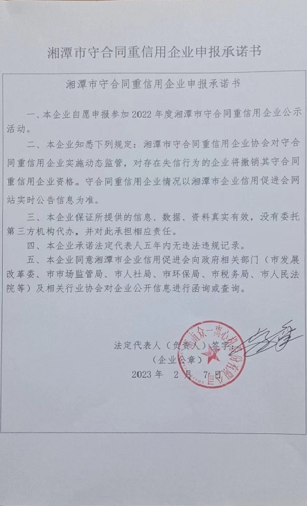 本企業(yè)根據(jù)《湘潭市守合同重信用企業(yè)申報(bào)規(guī)定》等編制 2022 年度企業(yè)信用報(bào)告書,并保證本報(bào)告書內(nèi)容真實(shí)、準(zhǔn)確、完整。