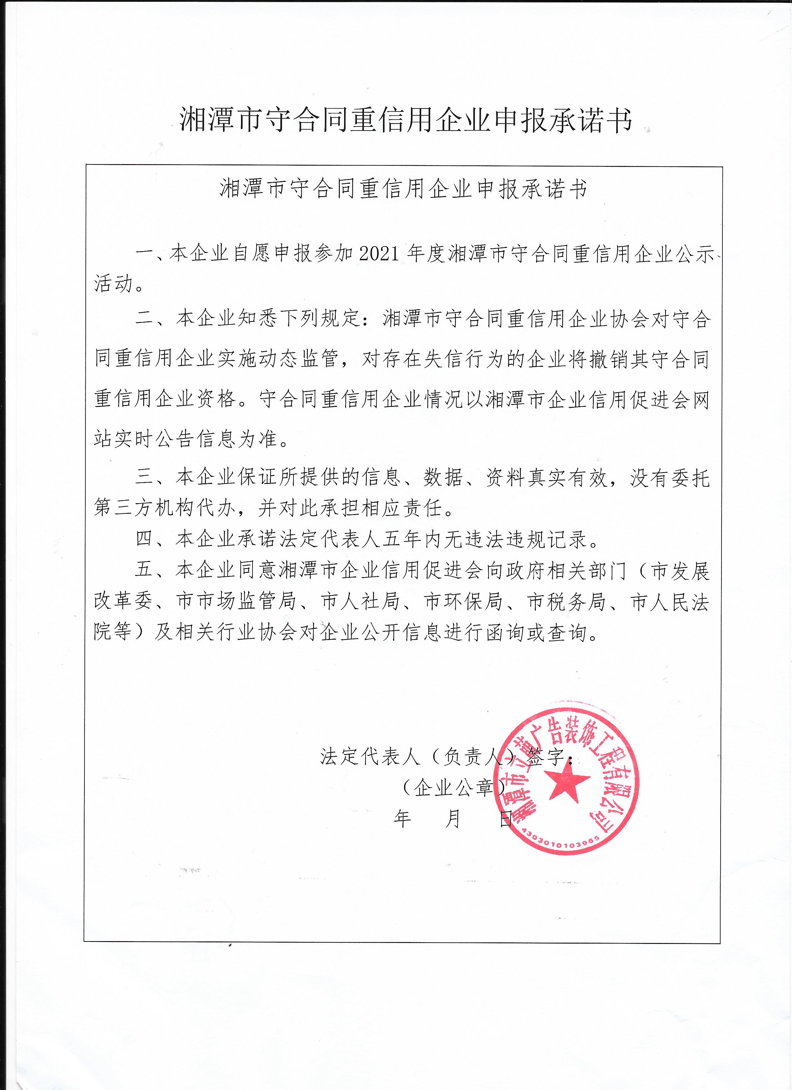 本企業(yè)根據(jù)《湘潭市守合同重信用企業(yè)申報(bào)規(guī)定》等編制 2021 年度企業(yè)信用報(bào)告書(shū),并保證本報(bào)告書(shū)內(nèi)容真實(shí)、準(zhǔn)確、完整。